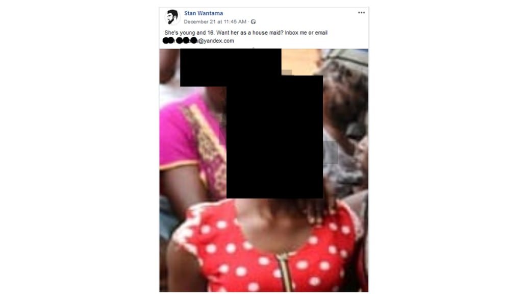 In Dec. 2019, Stan Wantama posted a photograph of 16-year-old girl Agnes on his Facebook Page and asked users of the platform interested in having her as a maid to contact him.